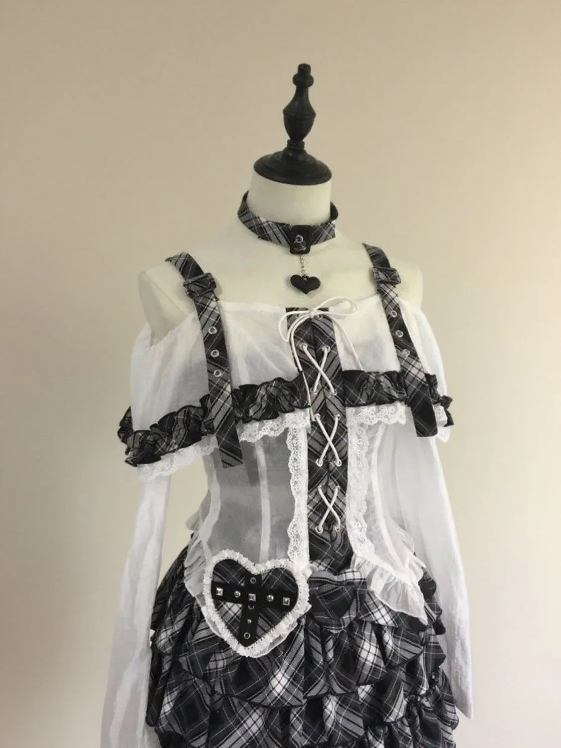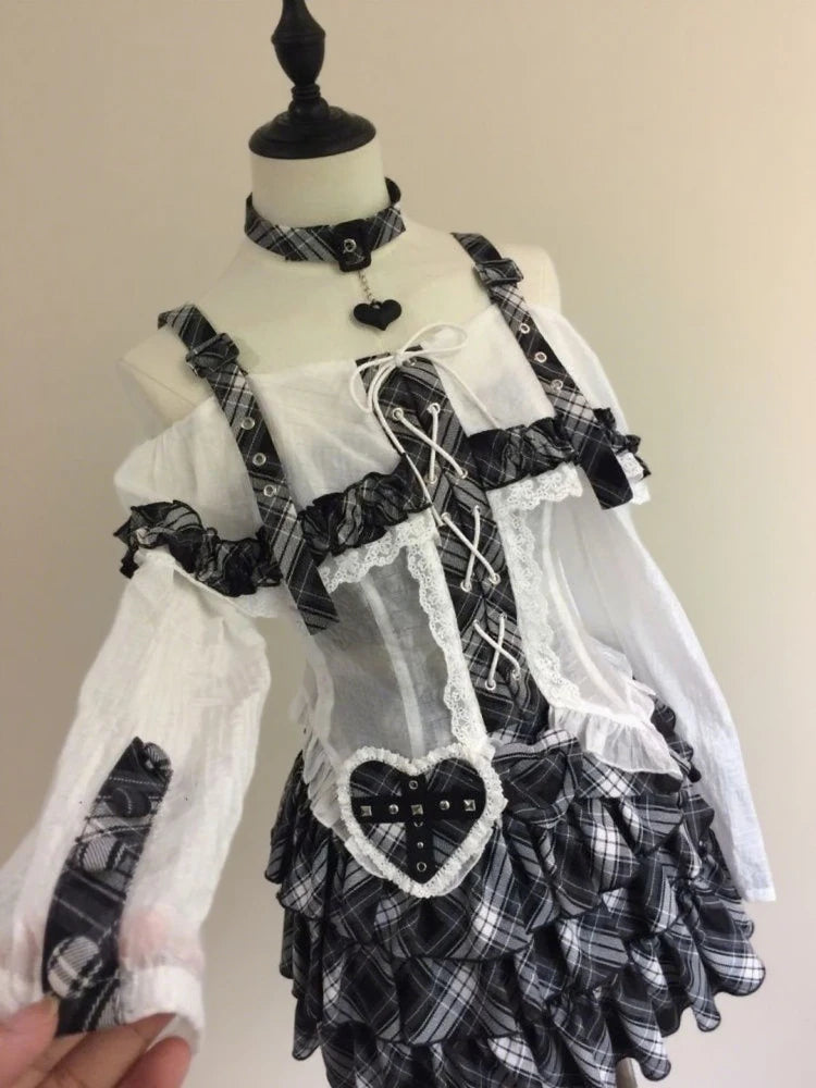 Japanese Punk Sweet Two Piece Sets Women's One-shoulder Lace Blouse + Plaid Cake Skirt New Vintage Fashion Harajuku Y2k Outfits