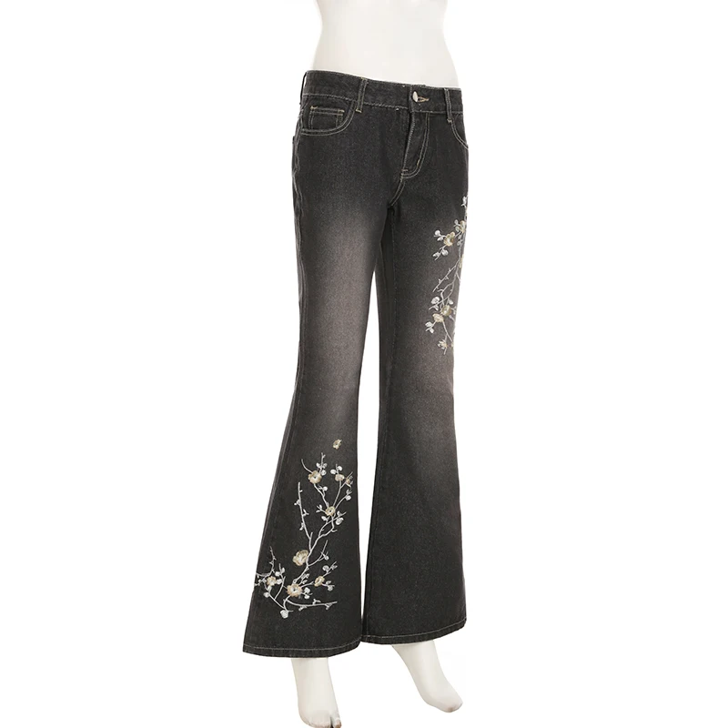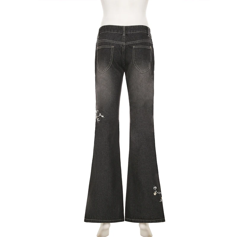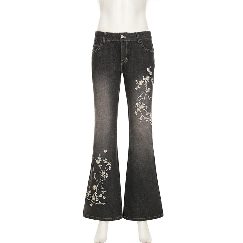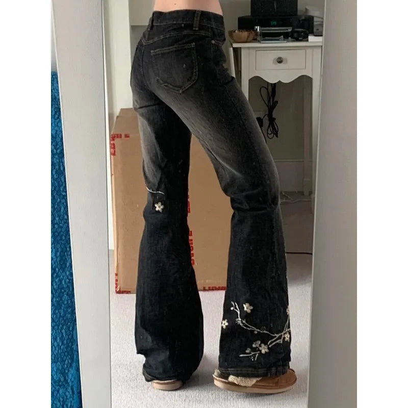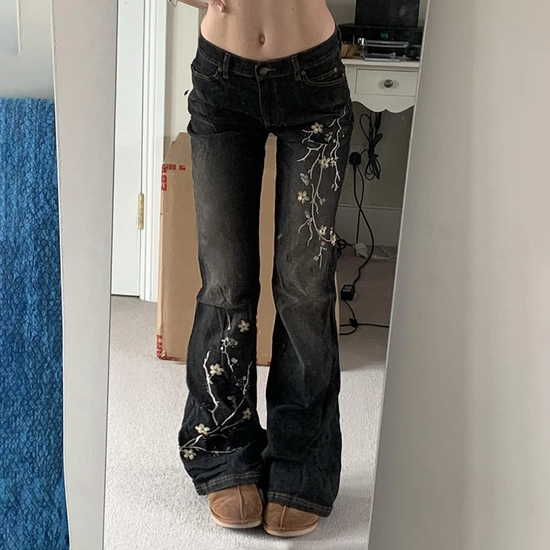 Weekeep Floral Embroidery Jeans Vintage 2000s Low Rise Flared Jeans Women Retro Baggy Denim Pants High Street Basic Trousers