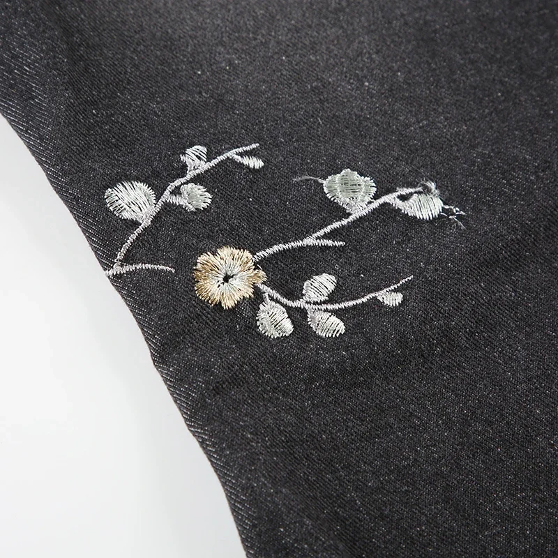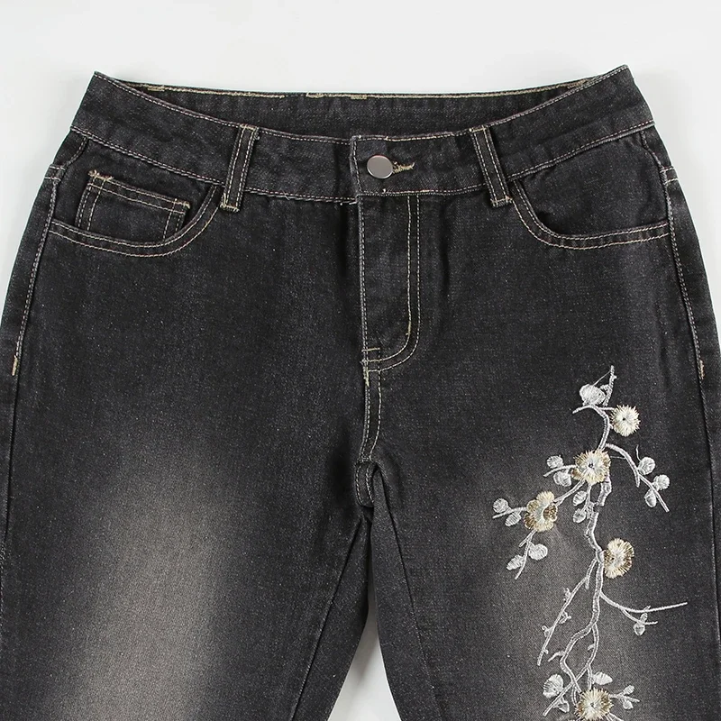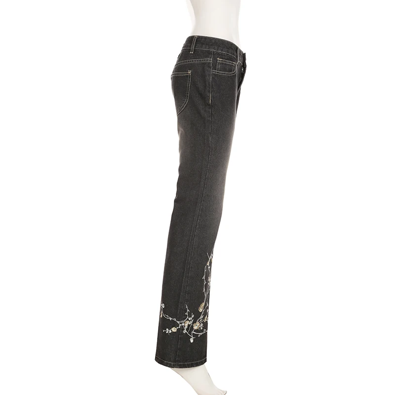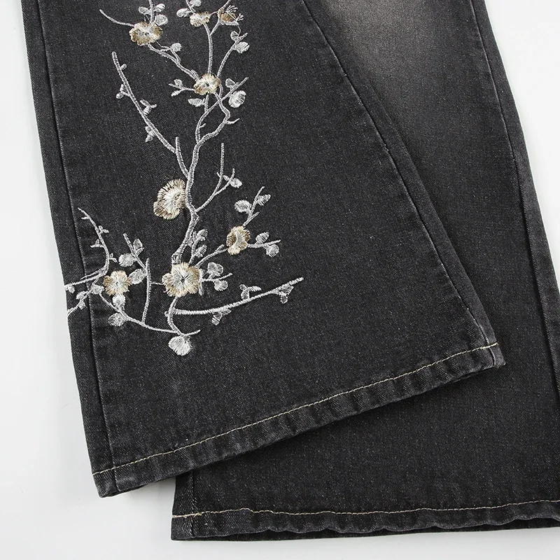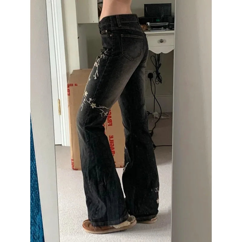 Weekeep Floral Embroidery Jeans Vintage 2000s Low Rise Flared Jeans Women Retro Baggy Denim Pants High Street Basic Trousers