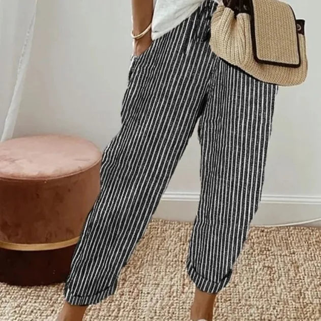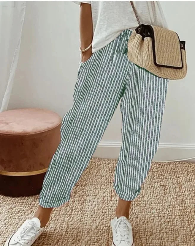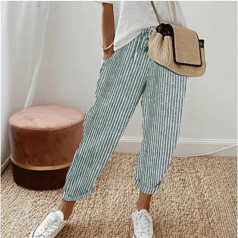 European and American Cross border Women's Summer New Fashionable Loose Stripe Printed Elastic Waist Drawstring Casual Pants
