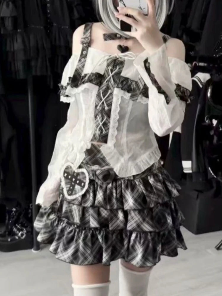 Japanese Punk Sweet Two Piece Sets Women's One-shoulder Lace Blouse + Plaid Cake Skirt New Vintage Fashion Harajuku Y2k Outfits