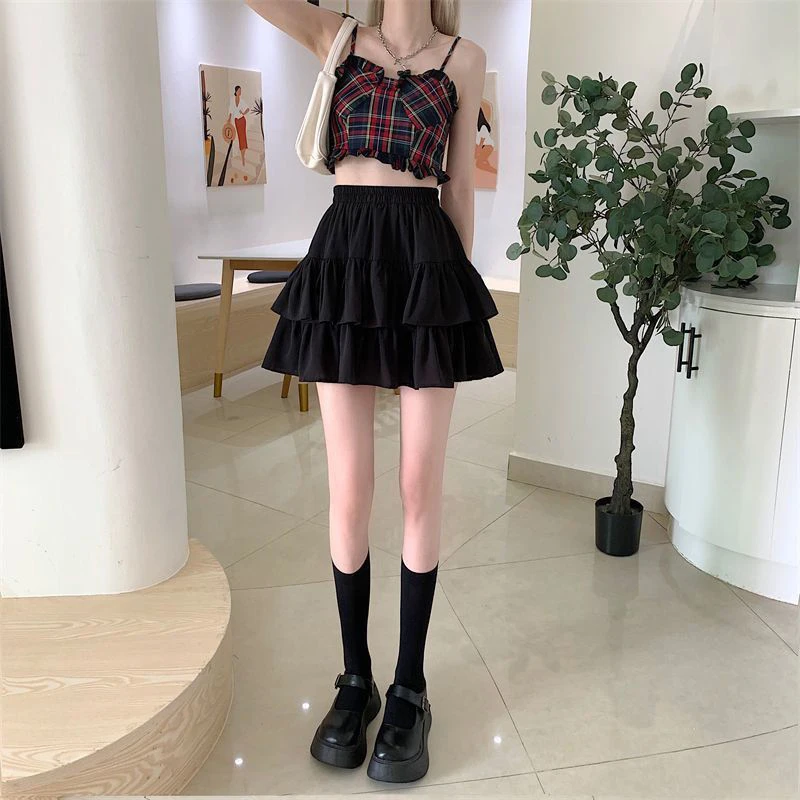 Pleated A-Line Skirt Women White Ruffle Sweet Tierred Pretty Style Skirt Elastic Waist Summer Slim Basic Korean Harajuku Dress